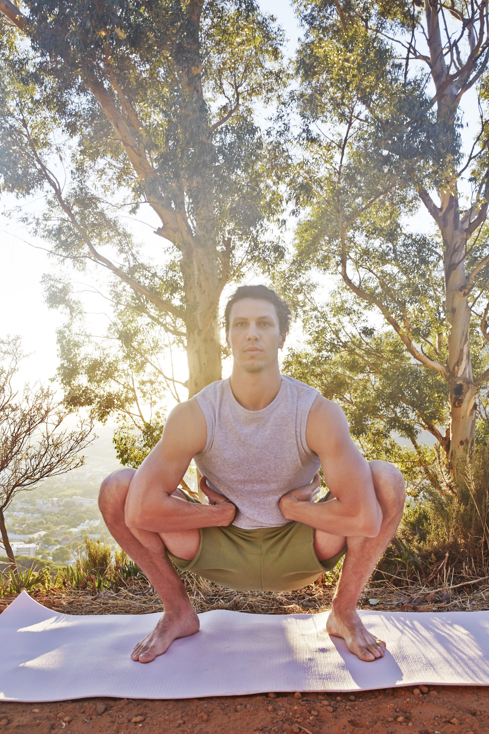 Dans cette posture, vous tournez les articulations des bras vers le corps (rotation interne). Asseyez-vous, pliez les jambes et posez les pieds à plat devant vous, légèrement plus écartés qu’à largeur de hanches. Pressez les coudes contre l’intérieur des genoux. Ensuite, repliez les avant-bras vers le ventre et pressez le dos des mains contre les flancs. Intensifiez l’exercice en plaçant les mains plus haut, ou facilitez-le en les baissant. Vous pouvez aussi accentuer l’effet de l’exercice en rapprochant les genoux l’un de l’autre. Finissez sur une expiration.